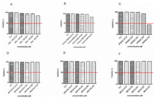 Figure 2 shows that the viability remains abundantly higher than the threshold required by the OECD (evidenced by the red line) for all substances up to 75 µM (Figure 2A,B,D–F), except for the APINAC (Figure 2C).