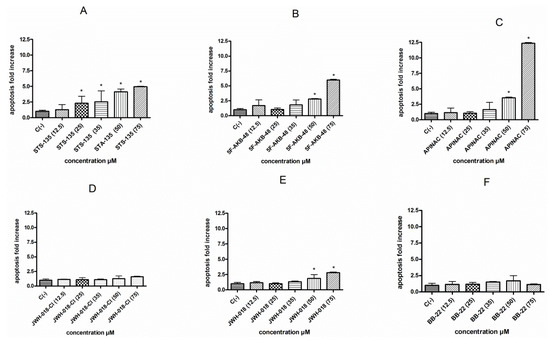 The involvement of the apoptotic process was analyzed by the Guava Nexin assay, which allowed us to highlight a different behavior among the six SCBs tested. In particular, the STS-135 was shown to induce a statistically significant apoptosis fold increase at all concentrations tested except at 12.5 µM. On the contrary, the cultures treated with 5F-AKB-48, APINAC, and JWH-018, showed a similar trend, corresponding to a statistically significant apoptosis fold increase starting from the 50 µM concentration. Finally, JWH-018-Cl and BB-22 were not found to induce apoptosis at any of the concentrations tested (Figure 3A–F).