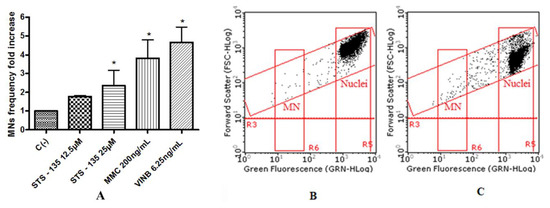 MN’s frequency fold increase on TK6 cells after 26 h treatment with STS-135 at the indicated concentrations with respect to the untreated negative control [C (-)] and to positive controls [MMC and VINB] (A), plot of nuclei and micronuclei in untreated control (B), and in 25µM treated (C). Data were analyzed using repeated ANOVA followed by Bonferroni post-test. * p < 0.05 versus C (-).