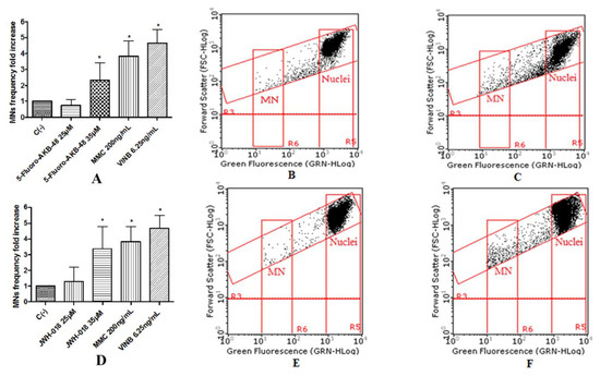 MN’s frequency fold increase on TK6 cells after 26 h treatment with 5F-AKB-48 (A) and JWH-018 (D) at the indicated concentrations with respect to the untreated negative control [C (-)] and to positive controls [MMC and VINB], plot of nuclei and micronuclei in untreated control (B,E) and in 35 µM treated (C,F). Data were analyzed using repeated ANOVA followed by Bonferroni post-test. * p < 0.05 versus C (-).