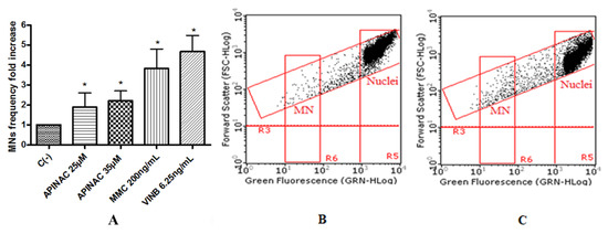 MN’s frequency fold increase on TK6 cells after 26 h treatment with APINAC at the indicated concentrations with respect to the untreated negative control [C (-)] and to positive controls [MMC and VINB] (A), plot of nuclei and micronuclei in untreated control (B) and in 25 µM treated (C). Data were analyzed using repeated ANOVA followed by Bonferroni post-test. * p < 0.05 versus C (-).