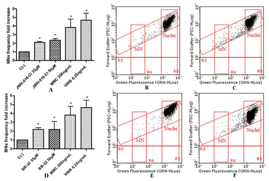 MN’s frequency fold increase on TK6 cells after 26 h treatment with JWH-018-Cl (A) and BB-22 (D) at the indicated concentrations with respect to the untreated negative control [C (-)] and to positive controls [MMC and VINB], plot of nuclei and micronuclei in untreated control (B,E) and in 35 µM treated (C,F). Data were analyzed using repeated ANOVA followed by Bonferroni post-test. * p < 0.05 versus C (-).