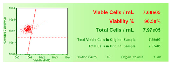 In order to detect cytotoxicity, the percentage of viable cells was evaluated by the Guava ViaCount Assay. After SCBs treatment, Guava ViaCount Reagent was added to the cells to discriminate viable from dead cells. This reagent contains the dye PI, which is only able to penetrate the altered membrane of necrotic cells, bind covalently to the DNA, and emit red fluorescence. In contrast, cells with an integral membrane are impermeable to PI and, thus, emit low red fluorescence. The viability and the total viable cell number were calculated automatically by the Guava ViaCount software (Merck, Darmstadt, Germany) and shown in the box next to the dot plot (Figure 8).