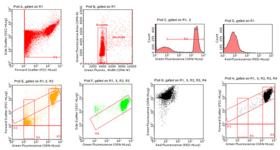 In plot A, the gate R1 allows one to remove debris and to select the events to be considered, on the basis of Forward Scatter (FSC) versus Side Scatter (SSC); doublets discrimination occurs in plot B, using green fluorescence pulse processing (width versus area) and by the gate “singlets”; in plot C, the gate R2 selects, between 101 and 104, the range signal to be considered, on the basis of MNs presenting a green fluorescence of about 100 times smaller than nuclei, positioned between 103 and 104; in plot D, the red fluorescence PMT voltage adjusting allows one to visualize nuclei deriving from viable cells, in the low red fluorescence region and to discriminate them from nuclei deriving from dead cells, potentially present in the high red fluorescence region; first, the gate R3 (plot E) and after the gate R4 (plot F) allows one to remove cell lysis residues and to select the events to be considered on the basis of green fluorescence versus FSC and of green fluorescence versus SSC, respectively; the SYTOX Green /7-AAD correct compensation is checked in plot G and in the last plot H occurs the final discrimination between nuclei and MNs on the basis of the different SYTOX Green fluorescence intensity and of the different size analyzed by FSC, because the MNs size varies between 1/3rd and 1/16th of the mean size of the main nuclei. The gate R5 (nuclei) and the gate R6 (MN) allow the software to perform statistical analysis and to measure for each sample the MNs frequency on 10,000 nuclei.