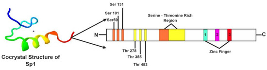The Co-crystallized Structure of specificity protein 1 (Sp1). The Sp1 protein is 785 amino acids long with a molecular weight of 81 kDa. The figure depicts the co-crystallized structure of Sp1, where the protein has three highly homologous C2H2 –type zinc finger motif-rich regions. This region is responsible for the binding to GC-rich DNA motifs (such as 5′-G/T-GGGCGG-G/A-G/A-C/T-3′ or 5′-G/T-G/A-GGCG-G/T-G/A-G/A-C/T-3′) and for the regulation of gene transcription of a large number of genes involved in various processes such as response to DNA damage, chromatin remodeling, cell growth, apoptosis, differentiation, and immune responses. The transcriptional activity of Sp1 can be modulated by several post-translational modifications including phosphorylation, acetylation, ubiquitylation, sumoylation, and glycosylation. The phosphorylation sites such as Ser59, Ser101, Ser131, Thr278, Thr335, and Thr453, were indicated in the figure. (Figures have been created with BioRender.io https://biorender.com/).