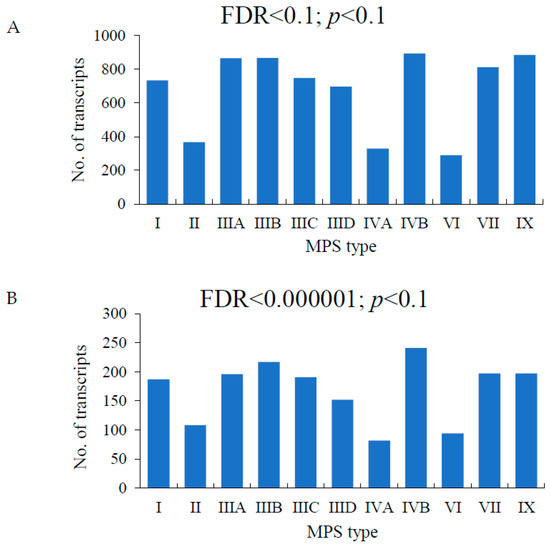 Number of transcripts with changed levels of expression (at FDR < 0.1; p < 0.1 (A) or FDR < 0.000001; p < 0.1 (B)) in different types of MPS relative to control cells (HDFa). FRD—false discovery rate; MPS—mucopolysaccharidosis.