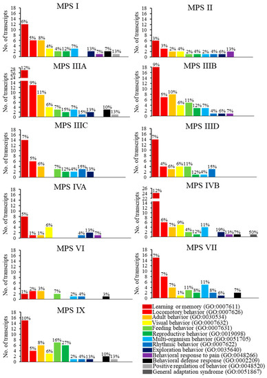 Number of transcripts, corresponding to genes from indicated sub-processes (child processes) of behavior (term GO:0007610), defined according to the QuickGO database, which levels were significantly changed in MPS cells (MPS type or subtype is indicated in each panel) relative to the control cells. Fractions (%) of genes represented in each given GO term being differentially expressed relative to HDFa are also demonstrated above corresponding columns. Each sub-process is indicated by different color, according to the legend presented in the right-lower corner.