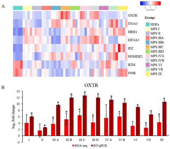 Genes which expression is significantly changed in at least six MPS types/subtypes relative to the control cells. Heat map of transcript levels is presented in panel (A) (MPS types and biological repeats are indicated). Comparison of results obtained for the OXTR gene using RNA-seq and RT-qPCR methods is shown in panel (B). Presented values are mean values from 4 experiments with SD shown as error bars. Statistically significant differences relative to control (HDFa) cells are indicated by asterisks.