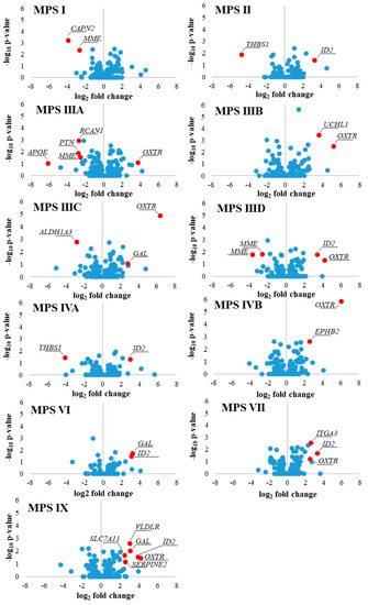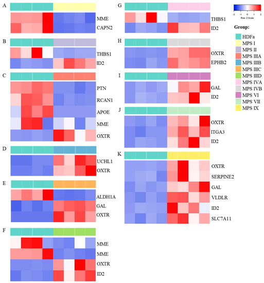 The results presented in Figure 3 indicted that there are some common features in patterns of expression of behavior-related genes in MPS, namely, expression of eight such genes (OXTR, ITGA3, HRH1, EIF4A3, ID2, HOMER2, B2M, and INSR) was significantly changed in six or more MPS types/subtypes. In the next step, we asked what genes are characterized by particularly significant changes in expression in each MPS type relative to control cells. In this analysis, the threshold was assessed to be log2 fold change (FC) > 2.5. The results are presented as volcano plots (Figure 4), heat maps (Figure 5), and column pictures (Figure 6). In volcano plots (Figure 4), the genes selected on the basis of FC versus p value analysis are indicated. Following genes reached the criterium of FC > 2.5 and statistically significant difference relative to control in particular MPS types: in MPS I, MME (coding for membrane metalloendopeptidase), CAPN2 (coding for calpain 2) (down-regulated) and ID2 (up-regulated); in MPS II, THBS1 (coding from thrombospondin 1) (down-regulated) and ID2 (up-regulated); in MPS IIIA, PTN (coding for pleiotrophin), RCAN (coding for regulator of calcineurin 1), APOE (coding for apolipoprotein E), MME (down-regulated) and OXTR (up-regulated); in MPS IIIB, UCHL1 (coding for ubiquitin C-terminal hydrolase L1), OXTR (up-regulated); in MPS IIIC, ALDH1A3 (coding for aldehyde dehydrogenase 1 family member A3) and GAL (coding for galanin and GMAP prepropeptide), OXTR (up-regulated); in MPS IIID, MME (down-regulated) and OXTR, IDS2 (up-regulated); in MPS IVA, THBS1 (down-regulated) and ID2 (up-regulated); in MPS IVB, OXTR, EPHB2 (coding for ephrin receptor B2) (up-regulated); in MPS VI, GAL, ID2 (up-regulated); in MPS VII, OXTR, ITGA3, ID2 (up-regulated); in MPS IX, OXTR, SERPINE2 (coding for serpin family E member 2), GAL, VLDLR (coding for very low density lipoprotein receptor), ID2, SLC7A11 (coding for solute carrier family 7 member 11) (up-regulated). The performed analyses allowed us also to consider alternative transcripts for particular genes. We found that the only gene with alternative transcripts which reached log2 FC > 2.5 and statistically significant difference relative to control was MME in MPS IIID (indicated in Figure 4). The potential meaning of changes in the expression of each gene is analyzed and discussed in Section 3.