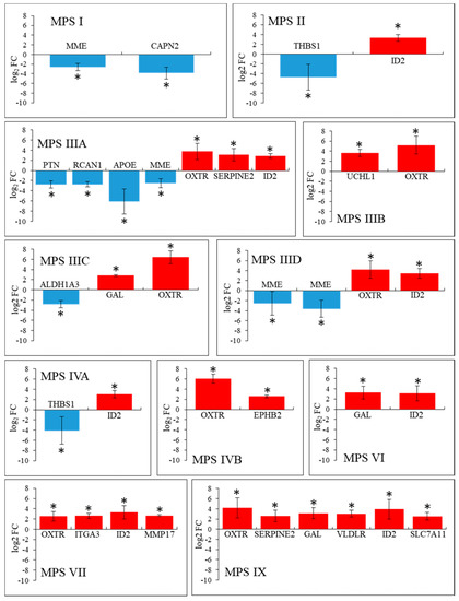 Genes which expression is particularly significantly changed (log2 FC > 2.5) in different MPS types/subtypes relative to control cells—quantitative analysis. Changes in levels of particular transcripts are presented for each MPS type relative to control cell line (HDFa). Names of genes are indicated. Down-regulation is marked in blue, and up-regulation in red. Presented values are mean values from 4 experiments with SD shown as error bars. Statistically significant differences relative to control (HDFa) cells are indicated by asterisks.