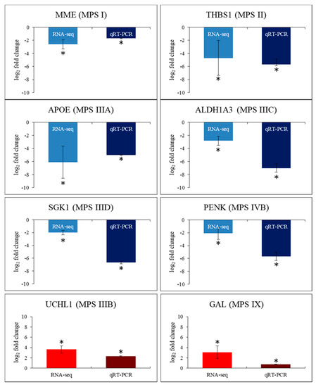 To test if RNA-seq results are reliable, we have analyzed mRNA levels of one gene in each MPS type/subtype using RT-qPCR. Results presented in Figure 7 demonstrate that RNA-seq and RT-qPCR data are compatible, as trends in expression changes were the same for all tested genes in all MPS types/subtypes. This indicates that analyses performed on the basis of RNA-seq data can be considered reliable.