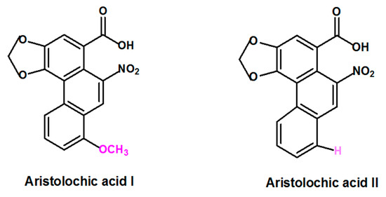 Aristolochic acid (AA) is a generic term that refers to a structurally related group of nitrophenanthrene carboxylic acids derived from plants of the Aristolochiaceae family that includes several species. Plant species belonging to Aristolochia and Asarum genera are the most reported to contain AA [3,16]. Aristolochic acid I (AAI) and Aristolochic acid II (AAII), two compounds that are structurally different only by the presence of the O-methoxy group at the 8-position for AAI and the absence of this O-methoxy group at the 8-position for AAII (Figure 1) are considered to be the most abundant and active components of AA [17].