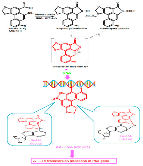 Proposed metabolic pathway of AAI and AAII which leads to their activation. AAI and AAII are reduced by NAD(P)H: quinone oxidoreductase 1 (NQO1), and cytochrome P450 1A1/1A2 (CYP1A1/2) into N-hydroxyaristolactams, which can further bind to DNA to form AA-DNA adducts, including7-(deoxyadenosin-N6-yl) aristolactam I and II (dA-AAI and dA-AAII), and 7-(deoxyguanosin-N2-yl) aristolactam I and II (dG-AAI and d G-AAII). N-hydroxyaristolactams can also react with sulfotransferases (SULTs) to form N-sulfoxyaristolactam, which can be transformed into aristolactam nitrenium ions? (There is still a matter of debate on the conversion of N-sulfoxyaristolactam into aristolactam nitrenium ions, hence the question mark in Figure 2.) These DNA adducts lead to tumor suppressor Tp53 gene mutations.