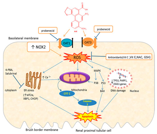 Therefore, there is evidence that AAI, once entering the renal cell through OATs [68,69], trigger oxidative stress which induces apoptosis through induction of ER and mitochondria stress, DNA damage, or activation of the MAPK pathway (Figure 3). AAI may also induce apoptosis through inhibition of the PI3K/Akt signaling pathway.