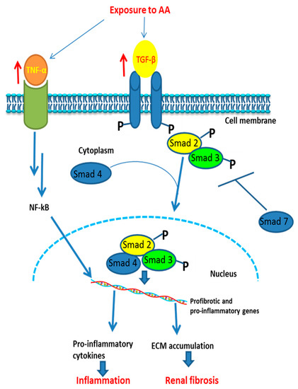 Proposed signaling pathway involved in AA-induced inflammatory responses and fibrosis in an animal model. ↑: increase of activation (of receptors); ┬ = inhibition; NF-κB: nuclear factor kappa-light-chain-enhancer of activated B cells; ECM: extracellular matrix; Smad: mothers against decapentaplegic homolog. Exposure to AA activates tumor necrosis factor (TNF) and transforming growth factor beta (TGF-β) which trigger a cascade of reactions leading to activation of proinflammatory and profibrotic genes, then to inflammation and fibrosis, respectively.