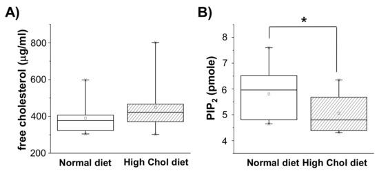 High-cholesterol diet decreased phosphatidylinositol 4,5-bisphosphate (PIP2) levels in the rat cerebral cortex. Starting at 13 weeks of age, 10 male rats were placed on a high-cholesterol diet and 10 male rats were placed on a normal diet for 6 weeks as described in Materials and Methods. Cerebral cortex was removed and membrane and cytosol fractions were obtained. (A) The levels of free cholesterol in the membrane fractions were measured by cholesterol assay kit. Box plots show average cholesterol level in normal diet (open bar) or high-cholesterol diet (hatched bar) groups. The horizontal black lines represent the median of each distribution and the squares indicate means (n = 10). (B) PIP2 levels in the membrane fractions were measured by using PIP2 ELISA kit. The levels of PIP2 were decreased by a high-cholesterol diet (n = 10). * p < 0.05.
