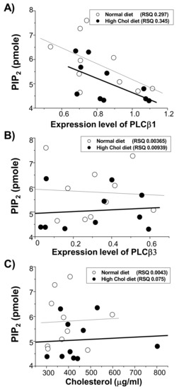 We next compared PIP2 levels along with cholesterol levels. As shown in Figure 3C, there was no correlation between PIP2 and cholesterol levels in either the normal (open symbols) or the high-cholesterol (closed symbols) diet rats, indicating that cholesterol level may not directly affect PIP2. Together, these results may indicate that the increased cholesterol level in the brain slightly increased PLCβ1 expression, reducing levels of PIP2. The effect of the high-cholesterol diet on the expression levels was specific for PLCβ1 given that we found no correlation between levels of PLCβ3 and PIP2.