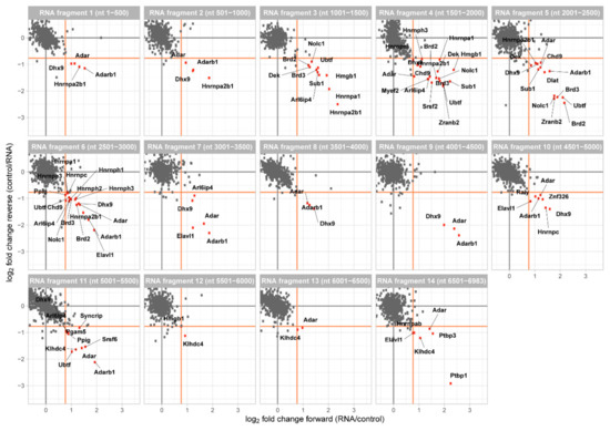 Two-dimensional interaction plot for each of the 14 RNA fragments. Fragments are numbered consecutive from 5′ to 3′ of murine Malat1 and their position within the lncRNA is indicated. Enriched proteins (fold change > 1.7, orange line) are marked in red and annotated.