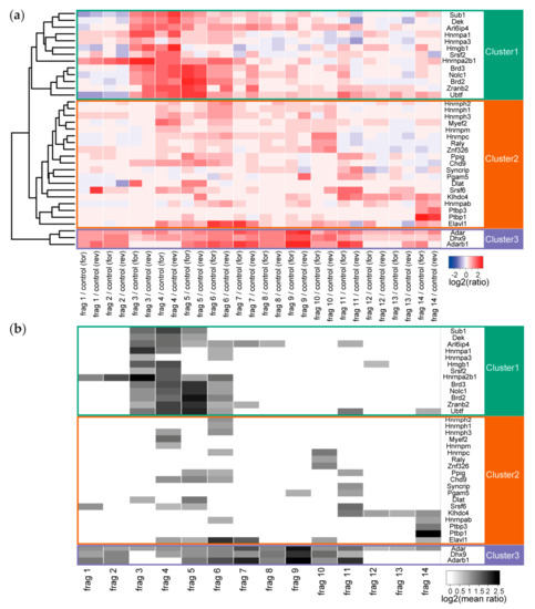 (a) Heatmap of all values for the enriched RNA-binding proteins at all Malat1 fragments (including the forward and reverse experiment). Cluster tree on the left edge reveals three major clusters representing different binding patterns of the interactors. (b) Filtered heatmap representation of the interactors only when fulfilling the 1.7-fold enrichment threshold.