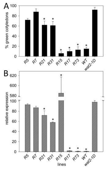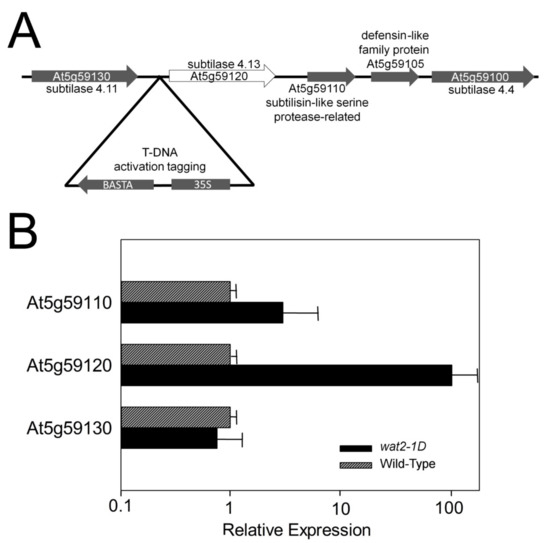 4.2. Isolation and Genetic Characterization of the Wat2-1D Mutant