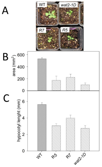 The transgenic plants (R5 and R7) also recapitulate additional phenotypic features of wat2-1D mutant, such as tolerance to hydrogen peroxide, lithium and norspermidine (Figure 4) and smaller plant size (Figure 5). Therefore, the wat2-1D mutant was renamed as sbt4.13-1D and the R5 line was selected as representative for further experiments.