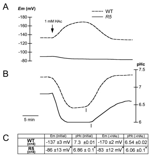 In order to determine if acid tolerance is caused by improved pHc homeostasis, electrophysiological studies were performed in root epidermal cells of seedlings two weeks old [13,16,17]. As indicated in Figure 6A,C, plasma membranes of mutant root cells were depolarized as compared to wild type (−86 versus −137 mV). This depolarization would explain tolerance to toxic cations such as lithium and norspermidine because the electrical potential contributes to the driving force for cation uptake [17,18]. Addition of acetic acid induces a reversible hyperpolarization in wild type (Figure 6A,C), explained by activation of PMA by intracellular acidification [16,19]. Of note, this hyperpolarization does not occur in the mutant. Also, to our surprise, pHc was more acidic in the mutant, both under normal conditions (6.86 versus 7.30) and in the presence of acetic acid (6.06 versus 6.54) and recovery from a pulse of acetic acid was slower than in wild type (Figure 6B,C).