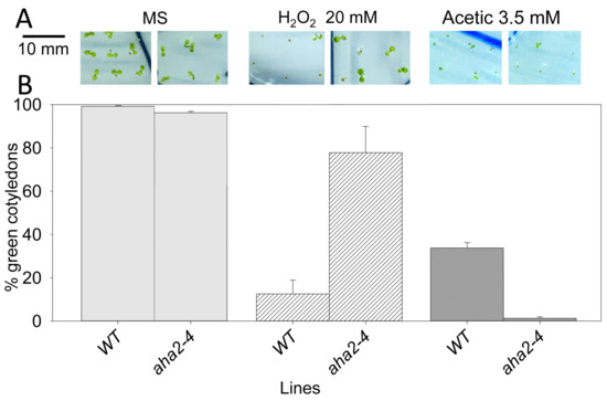 The aha2-4 mutant is tolerant to H2O2 but sensitive to acetic acid. Seedlings of wild type (WT) and aha2-4 mutant were germinated and grown for six days in normal MS medium and in medium containing H2O2 and acetic acid as indicated. (A): representative seedlings. (B): statistical data of green and expanded cotyledons from three experiments, each one with 30–40 seedlings from every line and condition. Error bars correspond to standard error and differences with wild type in medium containing H2O2 and acetic acid are statistically significant with p < 0.01 by Student’s t-test.
