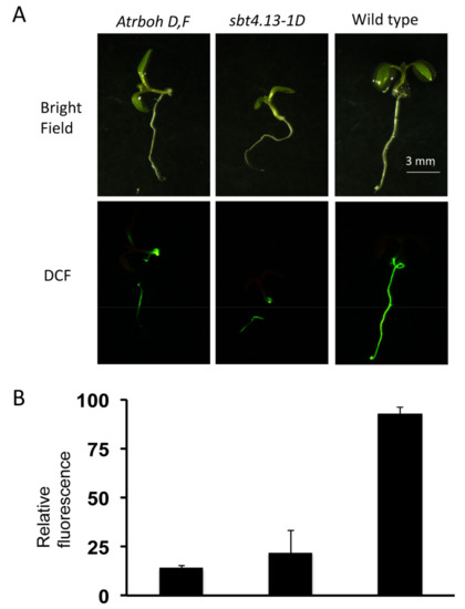 We tested if inhibition of acid-activated RBOH-D,F is due to degradation of the oxidases by immunodetection with specific antibody against a C-terminal peptide conserved in D and F oxidases (described in reference [24]). The results (Figure S5) indicate that, after correcting the scanned pixels (ImageJ program) of the oxidase band for total protein load, no significant decrease of oxidase protein (less than 15%) occurs in the sbt4.13-1D mutant. Therefore, the inhibition of acid-activated ROS production by over-expression of SBT4.13 must occur by a mechanism different from degradation of the oxidases.