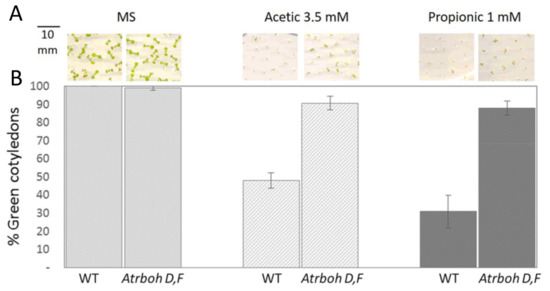 The Atrboh-D,F double mutant is tolerant to organic acids. Upper panels (A) show representative seedlings and the lower graphs (B) are statistical data of green and expanded cotyledons from three experiments, each one with 30–40 seedlings from every line and condition. Error bars correspond to standard error, and differences with wild type in medium containing acetic and propionic acids are statistically significant with p < 0.01 by Student’s t-test.