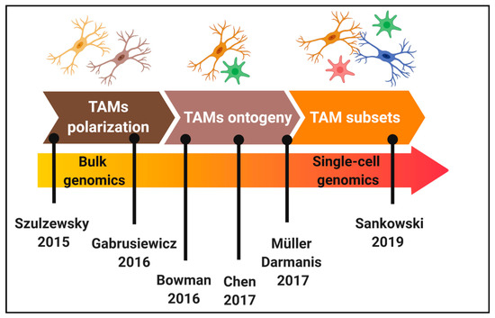 Chronology of the characterization of tumour-associated microglia/macrophages (TAMs) heterogeneity in glioblastoma (GBM). Key studies that have contributed to elucidate TAMs polarization, ontogeny and subsets in GBM mouse models and patients.