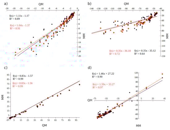 (a) polarization, (b) Coulomb, (c) Van der Waals and (d) Total inter–molecular interacion energies for 77 randomly oriented [sPyr][BF] dimers computed with AMOEBA–IL (MM) compared with QM EDA (SAPT) with (black), or without (red) inter–molecular polarization. Reproduced from Torabifard, H.; Reed, L.; Berry, M.T.; Hein, J.E.; Menke, E.; Cisneros, G.A. Computational and Experimental Characterization of a Pyrrolidinium-Based Ionic Liquid for Electrolyte Applications. J. Chem. Phys. 2017, 147, 161731. [].