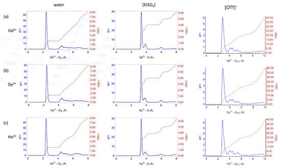 In the water/[EMIm][OTf] system, for for Gd, Dy, and Ho ions, the Ln–O patterns are similar. Ln-ions are coordinated with nine O atoms from six [OTf] anions in the first shell. The maxima for water/[EMIm][OTf] peaks are centered at shorter distances compared to water/[EMIm][EtSO]. This difference indicates that the binding strength between the Ln-ions and water in water/[EMIm][OTf] is stronger compared to only water or water/[EMIm][EtSO], possibly resulting from less steric repulsion between water and [OTf] than water–[EtSO] and water–water in the first coordination shell.
