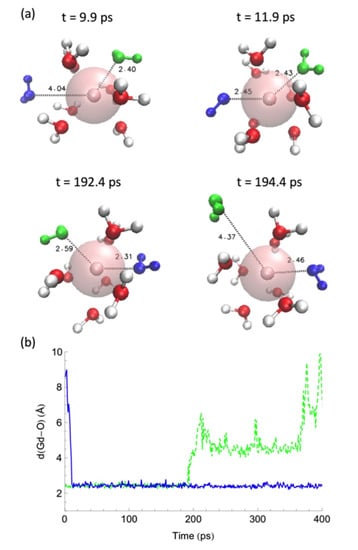 (a) Selected snapshots for a water exchange event on Gd in water and (b) corresponding cation—water distance along the MD trajectory. A similar behavior is observed for Dy and Ho in water. Reproduced from Tu, Y.-J., Allen, M.J., Cisneros, G.A., (2016) “Simulations of Water Exchange Dynamics on Lanthanide Ions in 1-Ethyl-3-Methylimidazolium Ethyl Sulfate ([EMIm][EtSO]) and Water”, Phys. Chem. Chem. Phys., 18, 30323–30333. With permission from the PCCP Owner Societies. [].