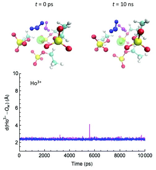 Selected snapshots for a water exchange event on Ho in water/[EMIm][EtSO] and corresponding cation–water distance along the MD trajectory. Similar behaviors were observed for Gd and Dy. Reproduced from Tu, Y.-J., Allen, M.J., Cisneros, G.A., (2016) “Simulations of Water Exchange Dynamics on Lanthanide Ions in 1-Ethyl-3-Methylimidazolium Ethyl Sulfate ([EMIm][EtSO]) and Water”, Phys. Chem. Chem. Phys., 18, 30323–30333. with permission from the PCCP Owner Societies [].