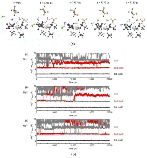 MD snapshots for a water-exchange event on Ho during the simulation time, and the distance trajectories of the water O atoms with (a) Gd, (b) Dy, and (c) Ho in water/[EMIm][OTf]. Reproduced from Tu, Y.-J.; Lin, Z.; Allen, M.J.; Cisneros, G.A. Molecular Dynamics Investigation of Solvent-Exchange Reactions on Lanthanide Ions in Water/1-Ethyl-3-Methylimidazolium Trifluoromethylsulfate ([EMIm][OTf]). J. Chem. Phys. 2018, 148, 024503. Copyright 2018 American Physical Society.