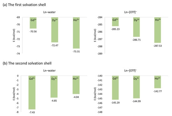 Average total interaction energies of lanthanide ions with a [OTf] anion and a first shell (a) and second shell (b) water. Reproduced from Tu, Y.-J.; Lin, Z.; Allen, M.J.; Cisneros, G.A. Molecular Dynamics Investigation of Solvent-Exchange Reactions on Lanthanide Ions in Water/1-Ethyl-3-Methylimidazolium Trifluoromethylsulfate ([EMIm][OTf]). J. Chem. Phys. 2018, 148, 024503. Copyright 2018 American Physical Society.