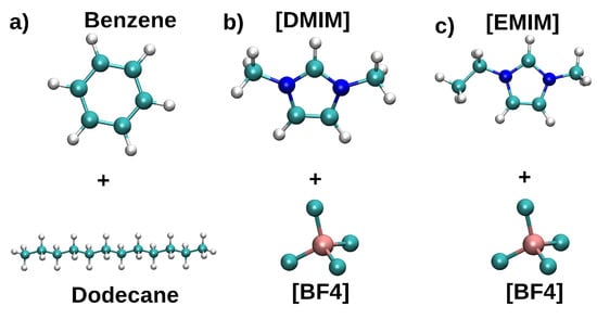 Schematic representation of molecules used for the simulation of benzene extraction from gasoline with ILs. (a) Benzene (PhH) and dodecane (NC12), (b) [DMIM][BF], and (c) [EMIM][BF] Reproduced from Vazquez-Montelongo, E.A.; Cisneros, G.A.; Flores–Ruiz, H.M. Multipolar/Polarizable Molecular Dynamics Simulations of Liquid-Liquid Extraction of Benzene from Hydrocarbons Using Ionic Liquids. J. Mol. Liq. 2019, doi:10.1016/j.molliq.2019.111846, [].
