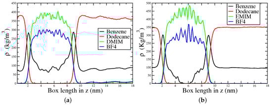 Density profile along the z direction for the (a) ternary mixture [DMIM][BF]/benzene/dodecane and (b) ternary mixture [EMIM][BF]/benzene/dodecane. Reproduced from Vazquez-Montelongo, E.A.; Cisneros, G.A.; Flores–Ruiz, H.M. Multipolar/ Polarizable Molecular Dynamics Simulations of Liquid-Liquid Extraction of Benzene from Hydrocarbons Using Ionic Liquids. J. Mol. Liq. 2019, doi:10.1016/j.molliq.2019.111846, [].