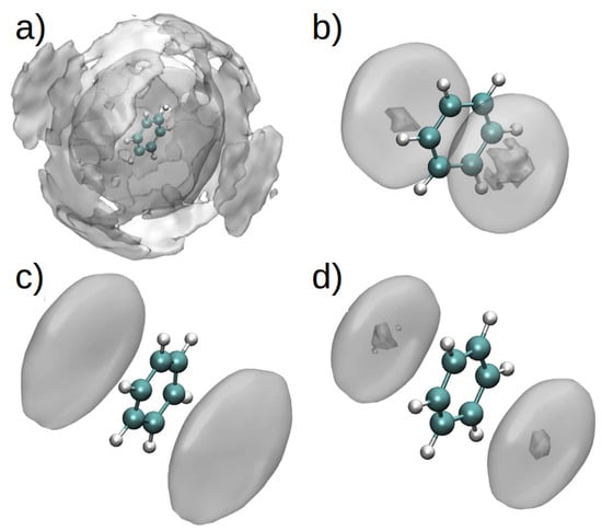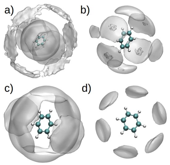 (a) SDF of PhH and the boron atom in [BF4], in a binary mixture (PhH-[DMIM][BF4]), (b) difference between the SDF of PhH and [BF4] in the binary mixture and the SDF of PhH and boron atom in [BF4] in the ternary mixture (PhH-NC12-[DMIM][BF4]). (c) SDF of PhH and the boron atom in [BF4], in a binary mixture (PhH-[EMIM][BF4]), (d) difference between the SDF of PhH and [BF4] in the binary mixture, and the SDF of PhH and boron atom in [BF4] in the ternary system (PhH-NC12-[EMIM][BF4]). Reproduced from Vazquez-Montelongo, E.A.; Cisneros, G.A.; Flores–Ruiz, H.M. Multipolar/Polarizable Molecular Dynamics Simulations of Liquid-Liquid Extraction of Benzene from Hydrocarbons Using Ionic Liquids. J. Mol. Liq. 2019, doi:10.1016/j.molliq.2019.111846, [].