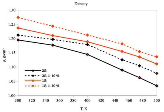 The mixture of these IL with 10% Li was also simulated. In general, the calculated densities for the mixture with both set of parameters are approximately 2%–4% higher than the density in the neat IL at the same range of temperatures (Figure 12). These results are consistent with densities obtained experimentally for other neat and Li/IL mixtures [,,,]. Similar to the neat IL, a noticeable change in density for the 1G and 3G systems (5.4% and 3.1%, respectively) was observed in the mixture between 400 and 450 K. For the 1G set of parameters at 400 K, the density (volume) correspond to 1.21 g/cm (275.06 Å), compared with 1.18 g/cm (282.31 Å) at 450 K. The density(volume) for the 3G system at 400 K are 1.18 g/cm (282.84 Å), whilst at 450 K the corresponding properties are 1.13 g/cm (296.31 Å).