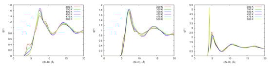 Radial distribution functions for [sPyr][BF] with three polarizable groups (3G) at different temperatures. Reproduced from Torabifard, H.; Reed, L.; Berry, M.T.; Hein, J.E.; Menke, E.; Cisneros, G.A. Computational and Experimental Characterization of a Pyrrolidinium-Based Ionic Liquid for Electrolyte Applications. J. Chem. Phys. 2017, 147, 161731, [].