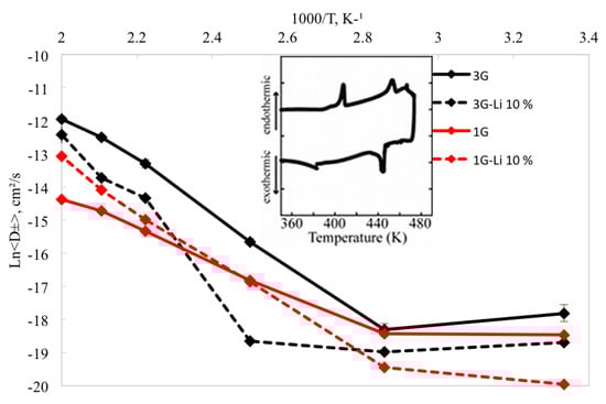 On the other hand, for the 10% Li mixture, the ions diffuse faster using the 1G parameter set: for temperatures between 450 and 500 K there is an increment in the diffusion coefficient with respect the neat IL. The mixture with intra-molecular polarization (3G model), shows that self-diffusion coefficient decreased at the same range of temperatures compared to neat IL 3G model.