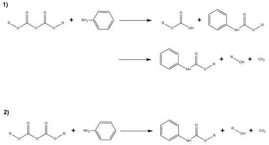 Reaction scheme for the N-tert-butoxycarbonylation of aniline. Panel (1) describes the step–wise mechanism and panel (2) describes the concerted mechanism mentioned above.