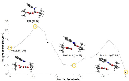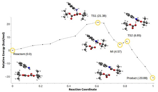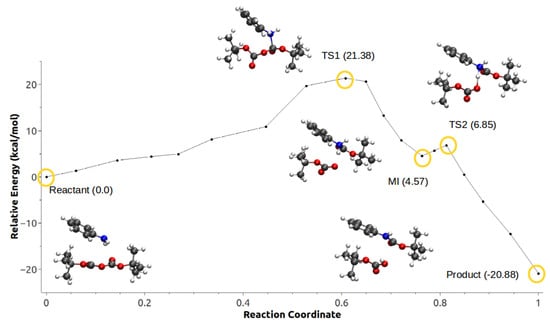 Minimum energy path for configuration 1, mechanism 1. Reproduced from Vazquez-Montelongo, E.A.; Vazquez-Cervantes, J.E.; Cisneros, G.A. Polarizable ab initio QM/MM Study of the Reaction Mechanism of N-tert-Butyloxycarbonylation of Aniline in [EMIm][BF]. Molecules 2018, 23, 2830, doi:10.3390/molecules23112830 [].