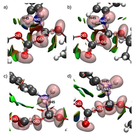 Combined ELF/NCI surfaces for the TS structures for the rate limiting step in Scheme c. (a) gas–phase, (b) di–chloromethane (implicit solvent), (c) configuration C1, (d) configuration C2. The isovalues for ELF is 0.83 and for NCI is 0.5 with a color scale of −0.05 au < sign(2) < 0.05 au. Reproduced from Vazquez-Montelongo, E.A.; Vazquez-Cervantes, J.E.; Cisneros, G.A. Polarizable ab initio QM/MM Study of the Reaction Mechanism of N-tert-Butyloxycarbonylation of Aniline in [EMIm][BF]. Molecules 2018, 23, 2830, doi:10.3390/molecules23112830 [].