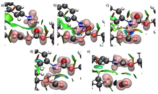 Analysis of the electronic wavefunctions via combined electron localization function (ELF) and non-covalent interaction index (ELF/NCI) were performed to obtain more insights related to the evolution of the intra- and intermolecular interactions in the system. The ELF/NCI analyses for the TS structures for both configurations for the rate-limiting step in mechanism 1 (Figure 19) shows a disynaptic basin between the C1 and N43 which suggests the formation of a covalent bond between these two atoms in the TS. This means that in all cases, the TS structure corresponds to the mentioned nucleophilic attack and is part of a late TS. By contrast the TS structures for the second mechanism in both configurations did not show a disynaptic basin between N43 and C1. Nevertheless, a strong attractive interaction in the form of a ring can be observed in Figure 20b.