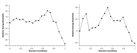 Minimum energy path for configuration 2, mechanism 2. Reproduced from Vazquez-Montelongo, E.A.; Vazquez-Cervantes, J.E.; Cisneros, G.A. Polarizable ab initio QM/MM Study of the Reaction Mechanism of N-tert-Butyloxycarbonylation of Aniline in [EMIm][BF]. Molecules 2018, 23, 2830, doi:10.3390/molecules23112830 [].