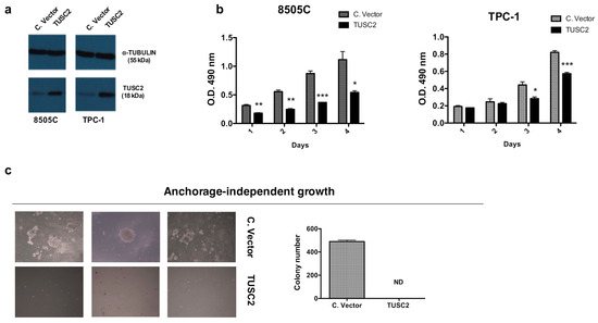 Additionally, the effect of TUSC2 on the aggressiveness of thyroid cancer cells was measured using a soft agar clonogenic assay. Figure 1c revealed that forced expression of TUSC2 dramatically decreased the growth rate of 8505C cells in soft agar.