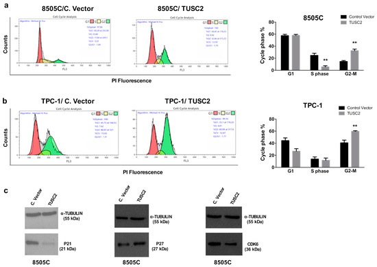 We analysed cell cycle progression in 8505C and TPC-1 transfected cells by flow cytometry with propidium iodide (PI) staining. Accordingly, we found that TUSC2 expression caused accumulation of the cells in the G2/M phase (Figure 2a,b). Furthermore, Western blot analysis was performed to analyse the expression level of several cell cycle regulators, and the results showed that p21 WAF1/CIP1 and CDK6 were decreased, while p27/KIP1 expression was increased in 8505C/TUSC2 cells compared to the control (Figure 2c). Therefore, TUSC2 restoration could represent an important tool to arrest cancer cell proliferation.