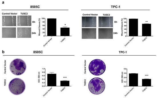 We found that 8505C/TUSC2 and TPC-1/TUSC2 cells showed less wound closure than cells transfected with the Control Vector at the same time point (Figure 3a).